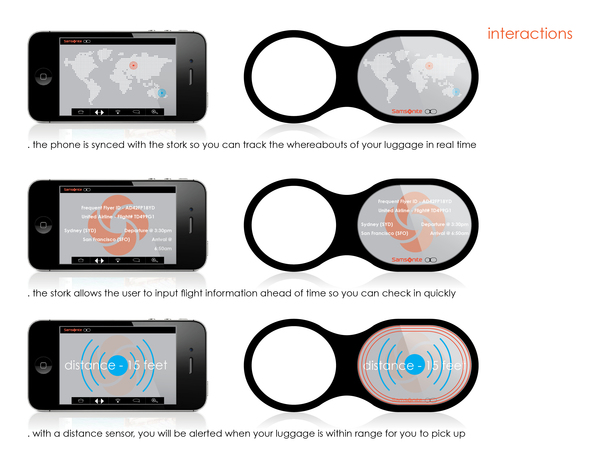 Samsonite Stork的概念是讓使用這先將其與電腦連接,在電腦內輸入個人、旅遊相關資訊,掛上行李箱,因Samsonite Stork有把Wi-Fi、RFID Chip植入行李標籤內,用戶可使用智慧型手機的APP追蹤行李所在位置。
