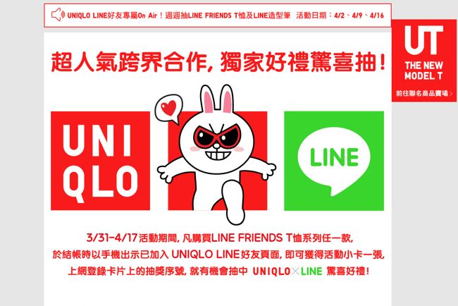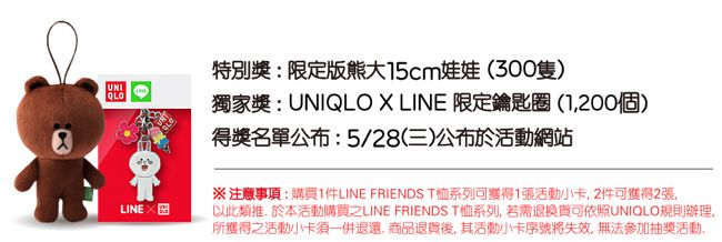 不過最重要的不是那兩大當紅品牌的合作,還有著購買可以抽驚喜好禮的抽獎活動呢!只要在3 月 31 日- 4 月 17 日購買 LINE FRIENDS T-Shirt 任何一款,就能在結帳時以手機出示加入 UNIQLO LINE 好友頁面拿抽獎序號參加抽獎。若是網路商店購買的朋友也不用擔心,4 月 28 日也會統一用電子郵件進行抽獎序號的寄送,購買一件可以得到一張、兩件兩張以此類推。
