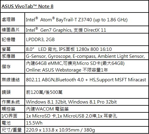 華碩推出全新8吋平板VivoTab™ Note 8,採用Windows 8.1作業系統,預建Microsoft® Office Home & Student 2013,並配備Wacom®1024階細膩感壓電磁筆,無論在商務應用或是繪圖筆記皆輕鬆一手掌握。VivoTab™ Note 8搭載 Intel® Atom™ Z3740處理器,輕盈380克機身,更容易單手握持,IPS面板超廣視角,多人分享畫面依然鮮豔清晰。靈活多工的處理效能與最長達8小時的電池續航力,讓時常在外洽談業務的使用者隨時保持最佳行動力。而Miracast無線影音傳輸技術,則能在簡報或影音瀏覽時將畫面同步分享至外接螢幕,一次滿足工作、娛樂豐富需求。