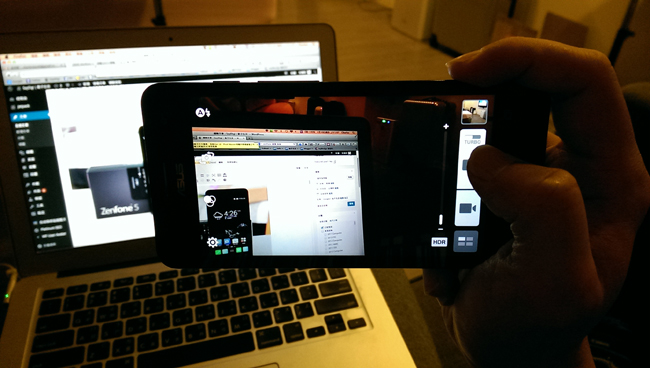 承襲 New Padfone Infinity 的使用者介面,Zenfone 5 的拍照攝影介面可以看到很多細節,從濾鏡、連拍功能、攝影模式、定位功能…,都一併設計到這個主畫面上,切換時再從選單進行選取,操作上相當直覺。