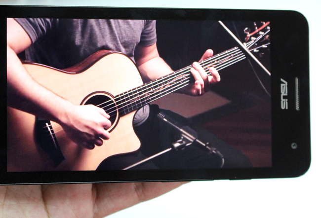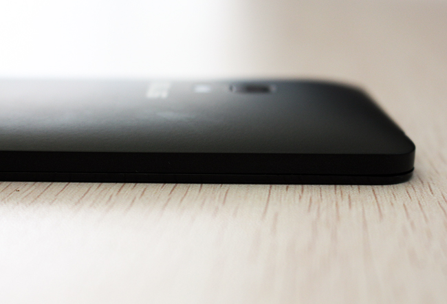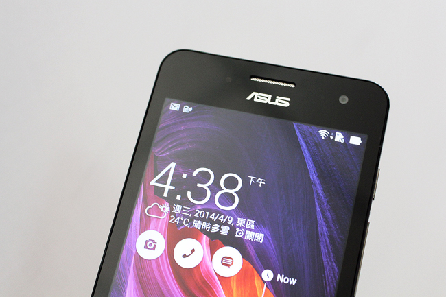 正面上方的部份則為聽筒與光源感應器,ASUS LOGO 旁則是 200萬畫素的前置鏡頭。根據官方規格表示,螢幕方面採用 1280 x 720(294 PPI) 的 IPS 面板,玻璃則是康寧大金鋼第 3 代,背光亮度最大為 400nits。