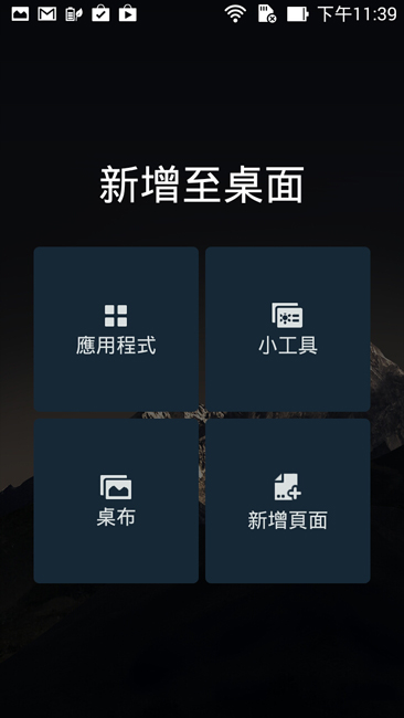 Zen UI 剛開始的主畫面除了上面所介紹的兩頁之外,另外一個頁面就是空白頁面了,我們可以按住畫面空白處,進而叫出小工具、應用程式或是設定桌布以及新增頁面等設定。