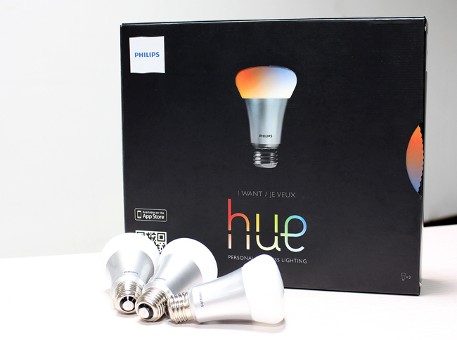盒裝中有三顆 LED 燈泡,關鍵的設計其實就在這個燈泡上,hue 燈泡提供了 600 流明的亮度,可以呈現各種豐富的顏色,之所以取名為「hue」(色相的意思),就是呈現不同波長的光照射,讓人眼感覺到不同的顏色(多達1600 萬種顏色的色彩選擇),hue 不論是白色、冷色調、暖色調都能表現出來,而且根據官方說法,比傳統燈泡還能減少使用 80% 的電力。