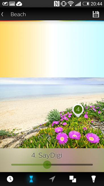 餐廳或是客廳都相當適合,假如剛好在客廳做瑜伽,可以來點海邊的情境,可以自行控制擷取色彩的標籤,看是要沙灘周圍的顏色或是岸邊草地的顏色,選擇後還能調整其亮度。