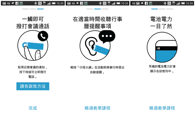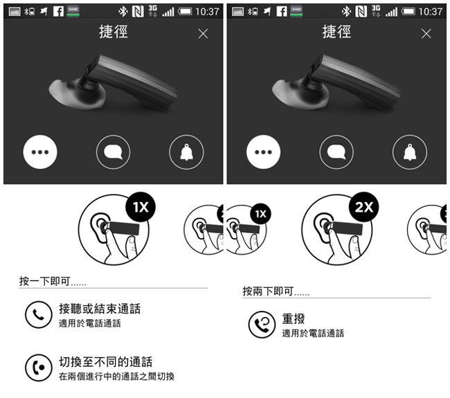 在通話控制方面,藉由 Jawbone New ERA 上方的控制按鈕,可以簡單的告訴手機現在要做什麼事,例如需要接聽或是結束通話就按一下,需要重播電話就按兩下。