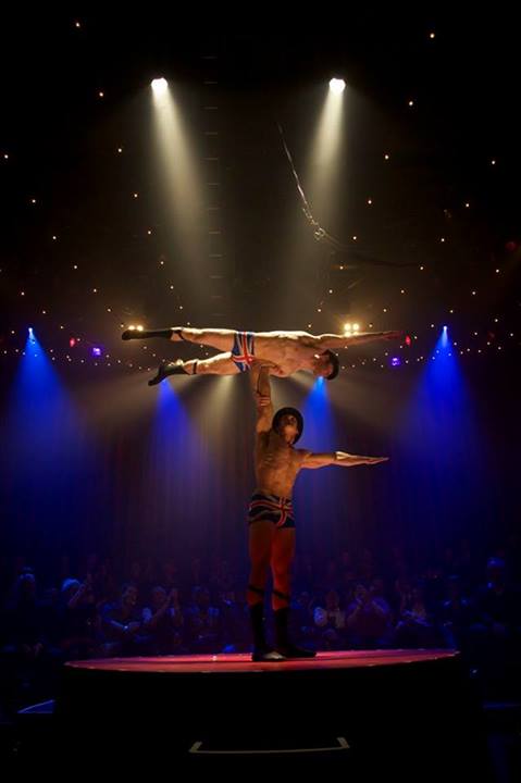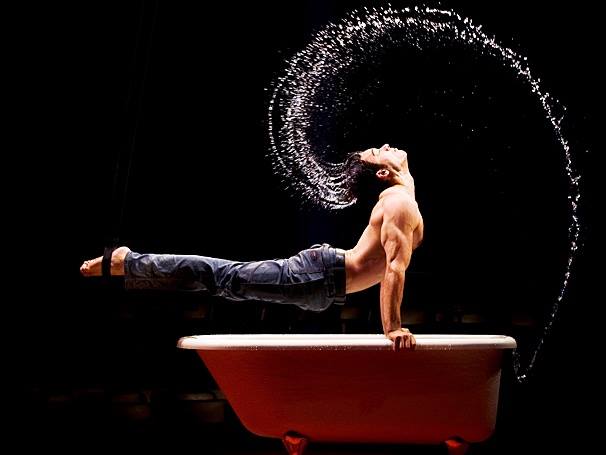 (雷又來了喔!)這場秀應該燃燒了很多女性觀眾的靈魂。因為開場的兩位西裝男士一邊表演精彩的雙人體操,一邊脫到只剩內褲,肌肉線條和體操表演都讓人大飽眼福。不過最經典的橋段就是工作人員把有水的浴缸搬上舞台,德國體操選手出身的這位先生就穿著一條牛仔褲、裸上身拉著兩條繩索,以浴缸為中心在空中飛來盪去,偶爾用嘴噴、偶爾用腳撩,四處噴射的水花讓工作人員替前排觀眾披上的遮雨布完全起了作用。體操與成人話題揉在一起,聽說這個表演者很紅,被暱稱為「浴缸男孩」。