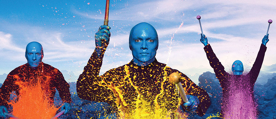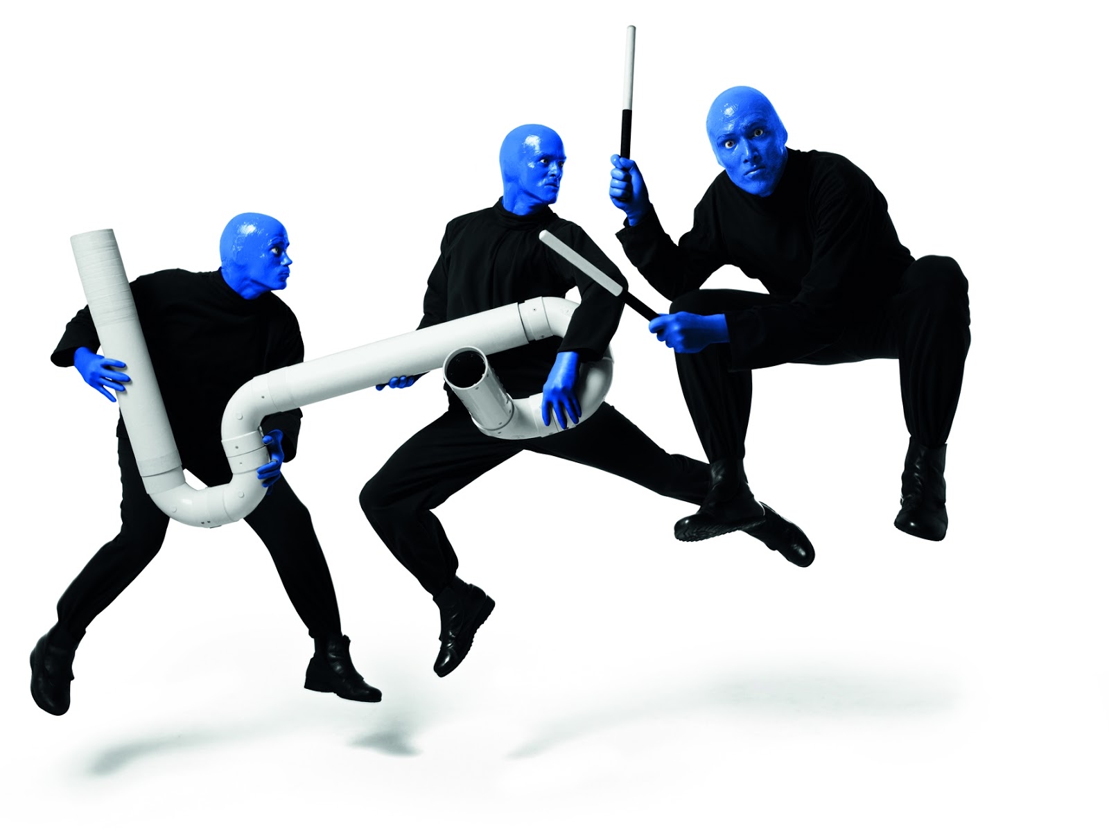 藍人劇團的表演是由好幾個小短劇組成,表演場地不大,一樓前排觀眾必須穿雨衣才不會被澎派打擊濺起的油漆噴到衣服。由於事前完全沒作功課,所以整場秀都讓人驚喜連連,原來,三個藍人除了表演音樂外,也有同樣肢體表情誇張的特技表演,和小小劇場裡的觀眾互動性很高,會CUE觀眾上台同樂。坐在二樓也不用怕無聊,因為藍人會從牆壁爬上來跟你玩。