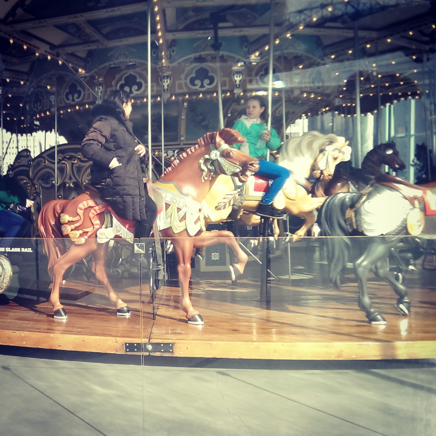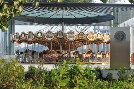 由於較約定時間提早不少抵達,我先到布魯克林橋下的「帝國富爾頓渡輪州立公園(Empire Fulton Ferry)」散步,這裡屬於布魯克林大橋公園的一部分,一眼盡覽兩座大橋、視野很好,還有華麗水晶風格的大型旋轉木馬Jane’s Carousel靜靜待在這裡。Jane’s Carousel建造於1922年的厄亥俄州,如今,透明玻璃屋保護這個阿嬤級的遊樂設施(票價兩塊美金)。