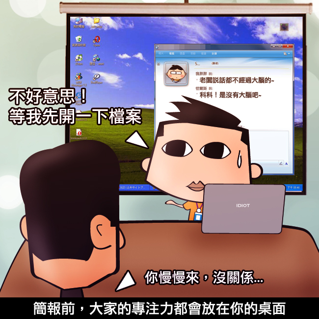 恰爾斯一直都很害怕上台報告的時候出包,所以簡報都盡量做得愈簡單愈好,看到有些同事使用了很多特效飛來飛去或是恰爾斯這輩子沒看過的字型,常常都會為他們捏一把冷汗,尤其是老闆請你幫他做簡報,預演時都跑得很順利又吸引人,賈伯斯的簡報也差不多這樣了…但一到現場,不是動畫跑不出來就是影片播不出來,除了留在台上流汗的老闆,大家也可以想像做簡報者的下場…