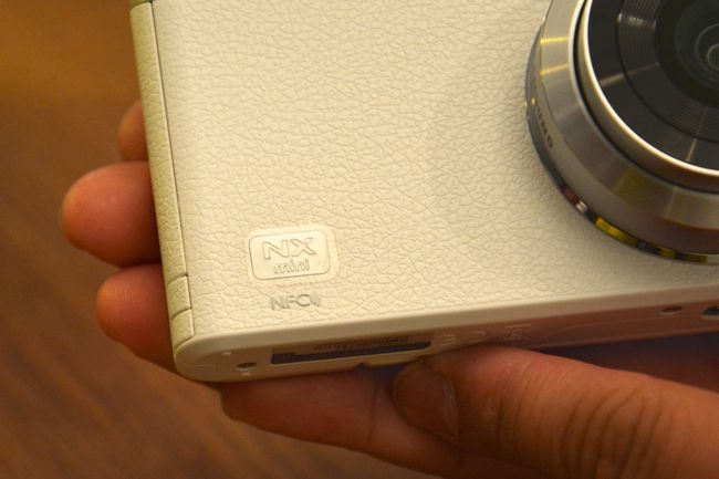NFC 傳輸方面,NX mini 也是繼SONY a5000 後所具備 NFC 的相機。使用者可以透過機身前方下角的NFC 感應位置與手上具有NFC 功能行動裝置進行照片傳輸。