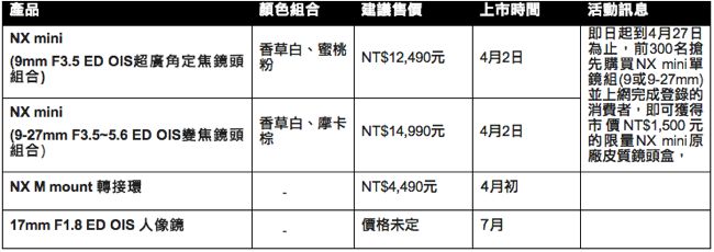 最後當然也是最重要的上市日期以及價錢, NX mini (9mm F3.5 ED OIS超廣角定焦鏡頭組合)共有香草白、蜜桃粉兩色選擇,建議售價NT$12,490元、NX mini (9-27mm F3.5~5.6 ED OIS變焦鏡頭組合)共有香草白、摩卡棕兩色選擇,建議售價NT$14,990。皆為即日起上市,並且即日起到4月27日為止,前300名搶先購買NX mini單鏡組(9或9-27mm)並上網完成登錄的消費者,還能獲得市價 NT$1,500 元的限量 NX mini 原廠皮質鏡頭盒。