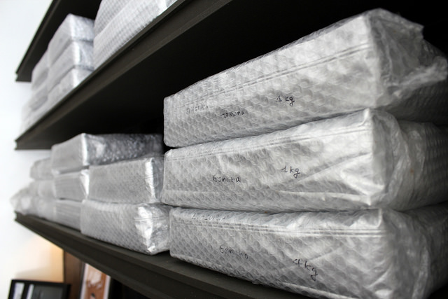 架上這些被包的紮實的是咖啡生豆,真空包裝可以減緩生豆風味衰退,但是費時耗工,小鬍子老闆能做到這點相當不容易。