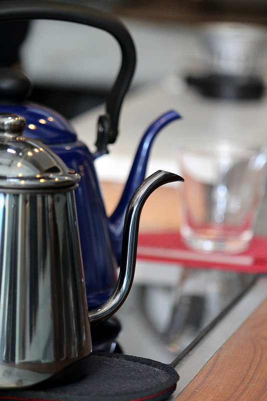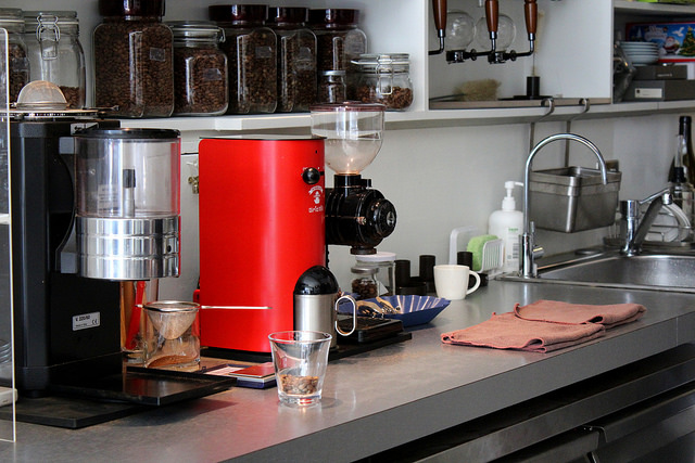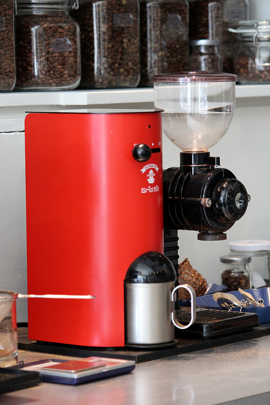 三款不同的磨豆機肩負起表現出不同風味的任務,紅色這台是老闆娘從東京琥珀咖啡扛回來的關口一郎老爺爺設計款磨豆機。