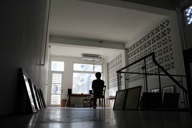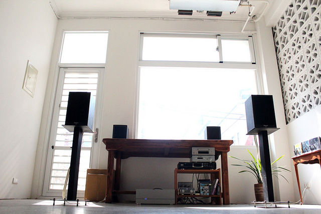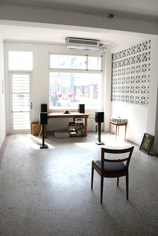 順著鐵梯走上二樓,空蕩蕩的,只擺了組音響、兩對喇叭和一張椅子。