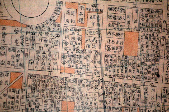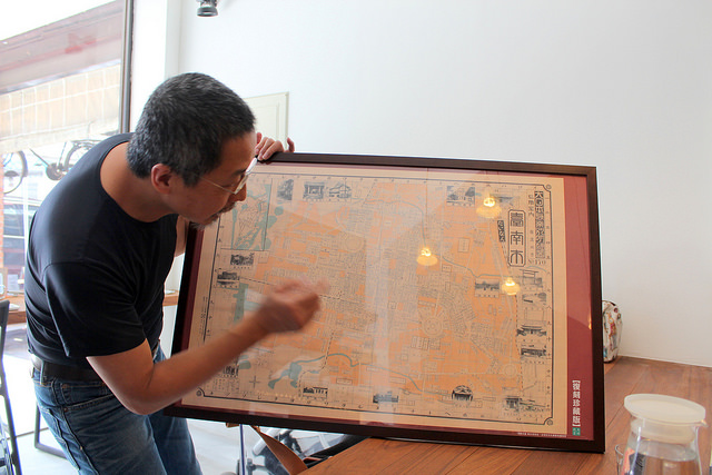 來找小鬍子老闆喝咖啡的這天,他送去裱框的台南市日治時期複刻版舊地圖剛好送來,鄰近西門圓環、大天后宮、開基武廟的本町四丁目,從地圖上林立的商店就能看出當時的繁榮盛況。