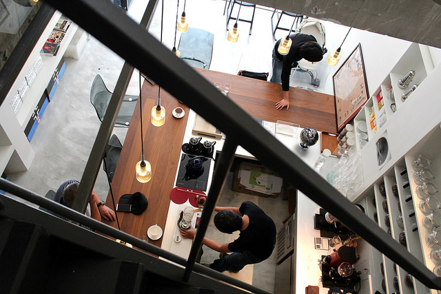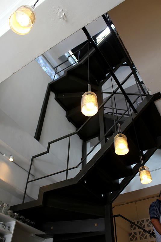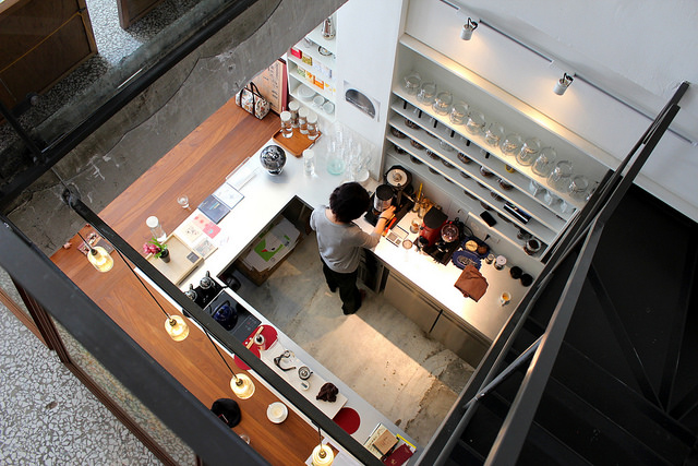 在台南道南館有個大家很喜歡的拍照角度,就是可以從上往下拍攝到吧檯沖煮咖啡的情況,因為小鬍子老闆把原本的樓梯捨棄不用,將吧檯正上方的樓板給切開來,另外再做個鐵梯上去,據說光是這項花費,就佔了裝潢費用的大部分。