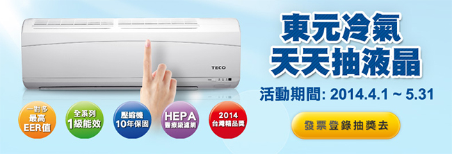 東元冷氣具備超越國際品牌的高產品規格及功能,它擁有節電省荷包的「一對多最高EER值」,全系列產品符合國家標準的「一級能效」,並提供業界第一的「壓縮機十年保固」,搭配「HEPA醫療級濾網」提供最佳空氣品質,產品還榮獲經濟部頒發「2014台灣精品獎」。全系列高品質的東元冷氣再推出天天抽液晶活動,是消費者今夏選購冷氣的最佳選擇,千萬不可錯過!