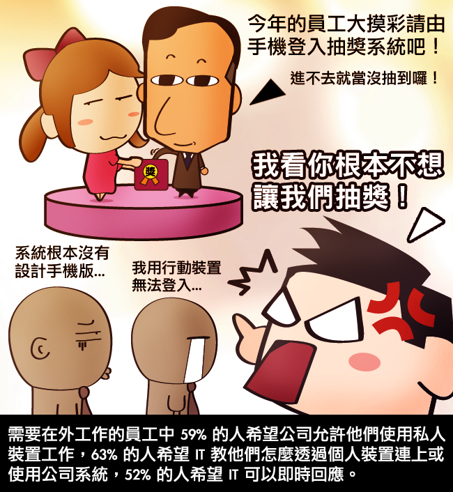 平常我們在工作上也相當仰賴行動裝置和雲端 App,但在公司常常遇到系統不合的事情,因為平台的不同,有的時候不能回 Email、沒辦法用 App 系統訂下午茶、回客戶訊息、用LINE請假(喂),IT 部門常常就是要幫同仁們處理系統不合或是抓不到資料的狀況,更慘的事常有裝置間不同步的狀況,限時團購幾乎沒辦法參與(淚),這樣怎麼會有競爭力呢!!!