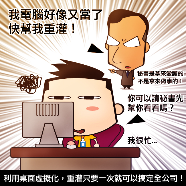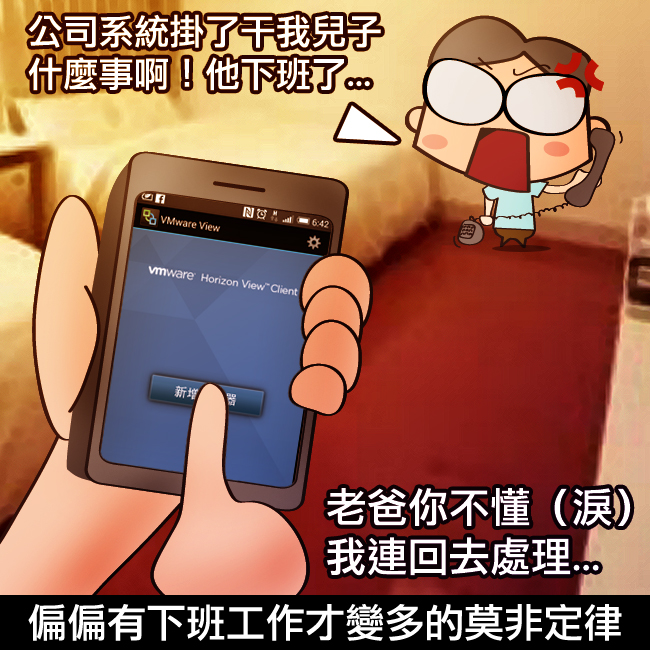 老闆總是希望透過一些工具來增加員同仁們的效率,IT 部門就是這個「工具」,設法用電腦科技來幫助大家快速解決問題,只是要解決的問題實在是太多了…解決問題並不難,但是一提到「成本」,大家壓力就大了,因為在 Cost Down 的情況下,IT 部門還要圓滿達成任務真的不容易啊!所以為了減少硬體的需求和工作的效率,可能需要藉由像 VMware 這樣虛擬化軟體公司所提供的服務,將應用程式虛擬化、雲端化,而且讓你不用在公司也能把工作完成,IT 夥伴們也不用程式寫得半死,公司是不是早該用一下了…
