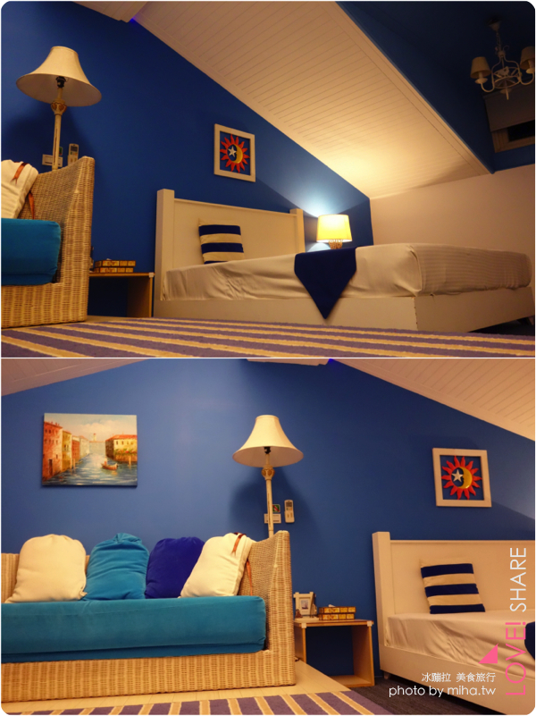 除了好睡的地中海大床外,沙發區也充滿了藍白地中海風格,但你以為只有這樣嘛?這裡還只是開始!!!