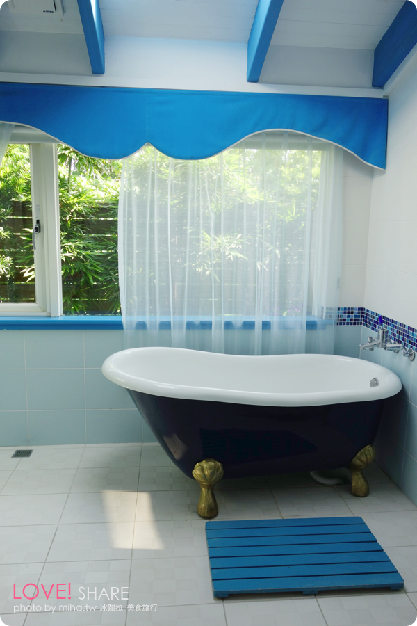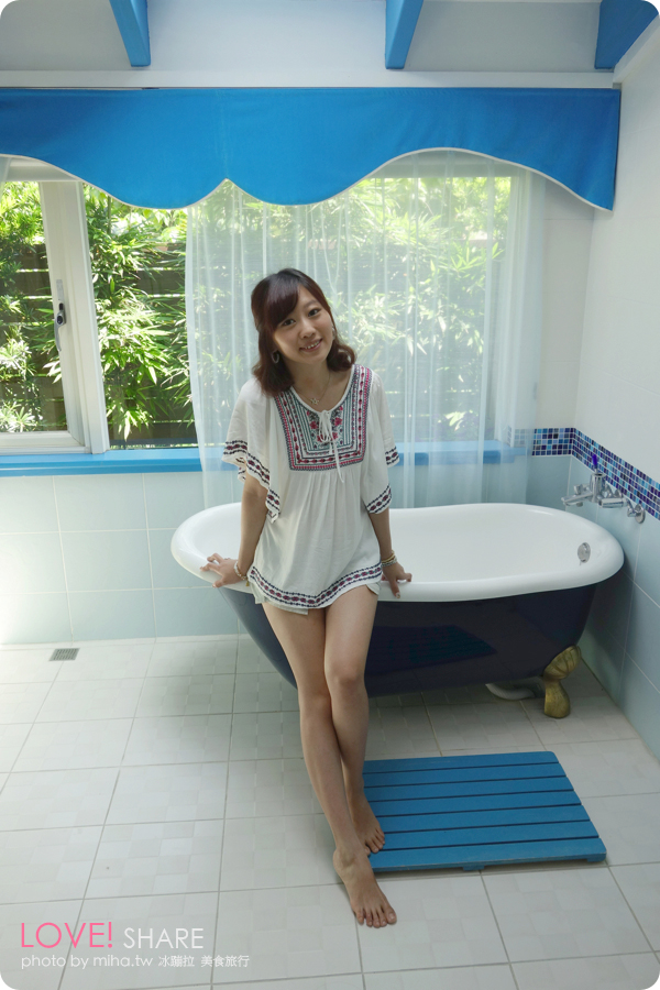 記得這裡的特色就是樓中樓大空間跟採光好還有很舒服可以泡澡的浴室!!!所以我們也擁有一個地中海風格超級涼爽的美麗浴缸,它還是寶藍色的耶!太美了吧~