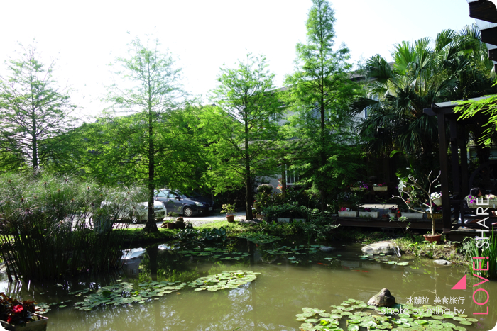 一走出房間看到就是天氣爆炸好的宜蘭,外頭的水池搭上旁邊已經翠綠的落雨松好美好美喔~第一次覺得早起這麼幸福,好期待早餐!