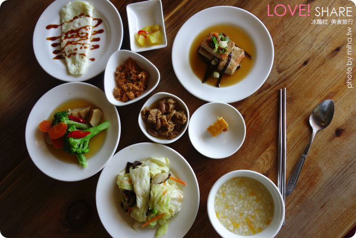 這裡是主人們一大早就起床準備的中式早餐,除了土司跟小米粥、水果外,都會幫你準備好送上桌,有夠豐盛一上桌我都傻了吃的完嘛?民宿主人驕傲的說他們青菜都自己種,連蘿蔔都是自己醃的喔,每道菜都不加味精非常健康天然,可以放心享用,每樣都好吃,我們把它都吃光光了!