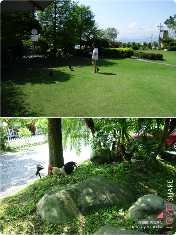 這些雞們真的每天都在民宿到處悠閒的走動,連打開民宿門都可以看到雞群,對沒在鄉下生活過的我來說每次看到都可以大呼小叫的,太好玩了,民宿男主人說養公雞就是要把房客們叫醒,我們平常在都市都沒有享受到這種早起的田野生活,其實在這裡醒來然後吃豐盛早餐,在跑出去草地拍拍照餵餵雞真的心情變得超好,完全紓壓跟一般要早起上班的心情截然不同,好開心啊~