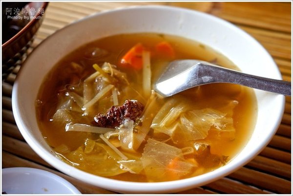 ▲阿嬤ㄟ菜尾湯,湯頭清澈,裡面放了紅蘿蔔、高麗菜、黑木耳、白蘿蔔等配料,感覺頗為豐富。