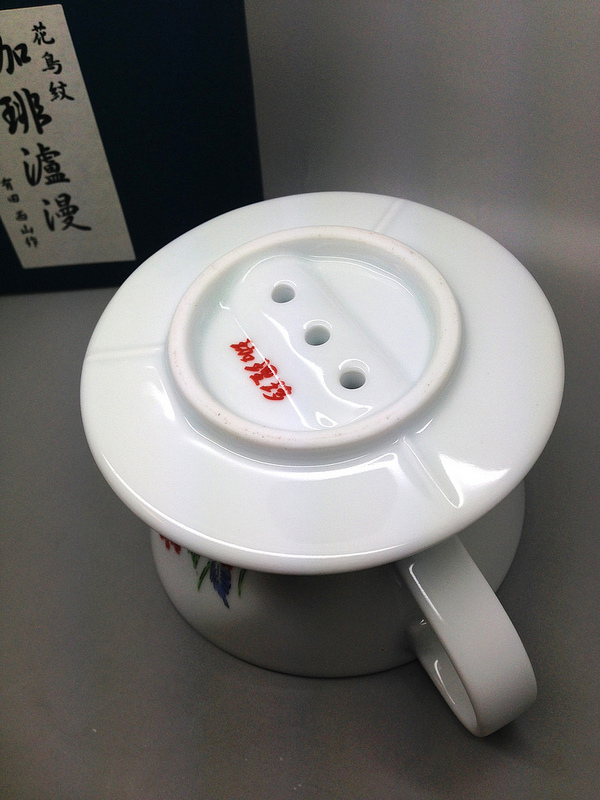 說是姊妹作其實也不竟然,從包裝上印著的「有田 西山作」就可以知道,這款花鳥紋有田燒濾杯是來自於西山窯的產品,而之前介紹過的錦唐草紋則是來自和山窯,印的是「有田 和山作」,這樣勉強算是遠房表姊妹吧!