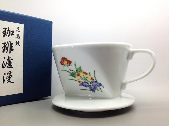 曾經為大家介紹過一款「有田燒咖啡濾杯 錦唐草」,而這個花鳥紋則算是它的姊妹作,同屬於 Kalita (株式会社カリタ) 的產品,具體發售年代已不可考,以精緻的禮盒式外包裝來看,應該是定位為送禮餽贈的用途,所以流通數量不多。
