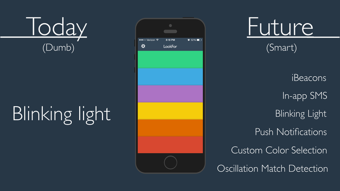 LookFor是一個找朋友的APP,再笨的人也會使用,它有數種閃爍的顏色可選擇,在與朋友同行時,告訴他們萬一走散了,會使用什麼顏色找他們?到與朋友走散時,打開APP,選擇螢幕幕閃爍的顏色。