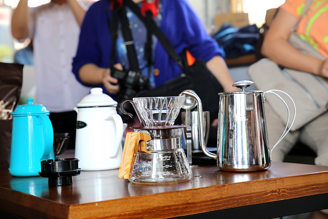 想當然,說的一嘴好咖啡的大叔我,對於教學肯定是不夠專業,所以請到珈堂咖啡黃可樂來帶領大家進入手沖咖啡的世界。由於今天到場的板橋美食里民們很多都是生平第一次手沖咖啡,所以用上的是比較常見的 HARIO V60 咖啡濾杯,搭配 KALITA不銹鋼手沖壺,另外還有橄欖木把玻璃壺來盛接咖啡。