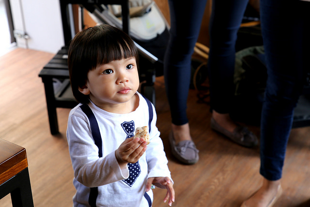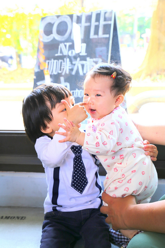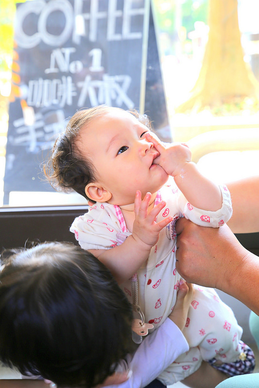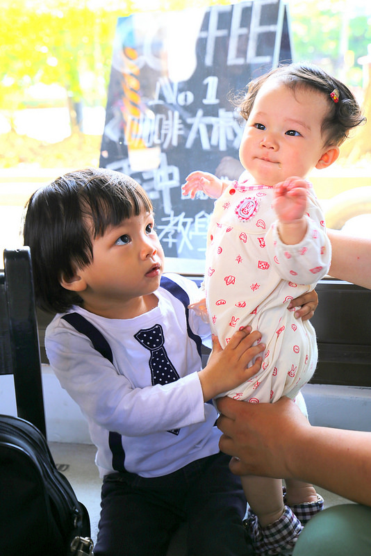 今天來參加的其實有兩位天后,除了要保持低調不露臉的魔鬼甄之外,還有單篇文章點閱率動不動就破幾個萬的,親子部落客天后野蠻王妃。可惜小安安太愛他媽媽,王妃空不出雙手來沖咖啡,大叔只好派出我的乖女兒去誘惑小安安,一開始狀況還不錯,最後我女兒竟然狂吃自己手指跟流口水,形象都破壞光了。