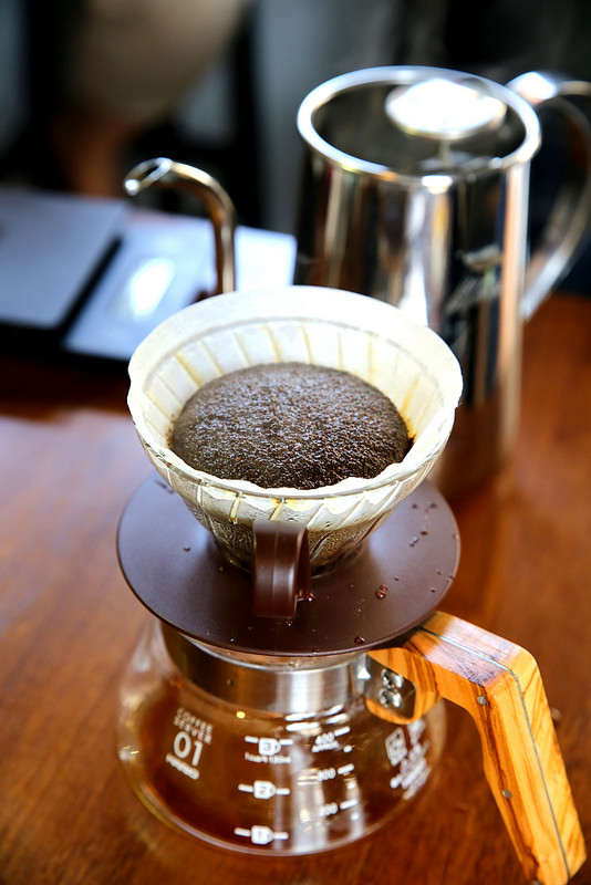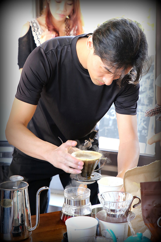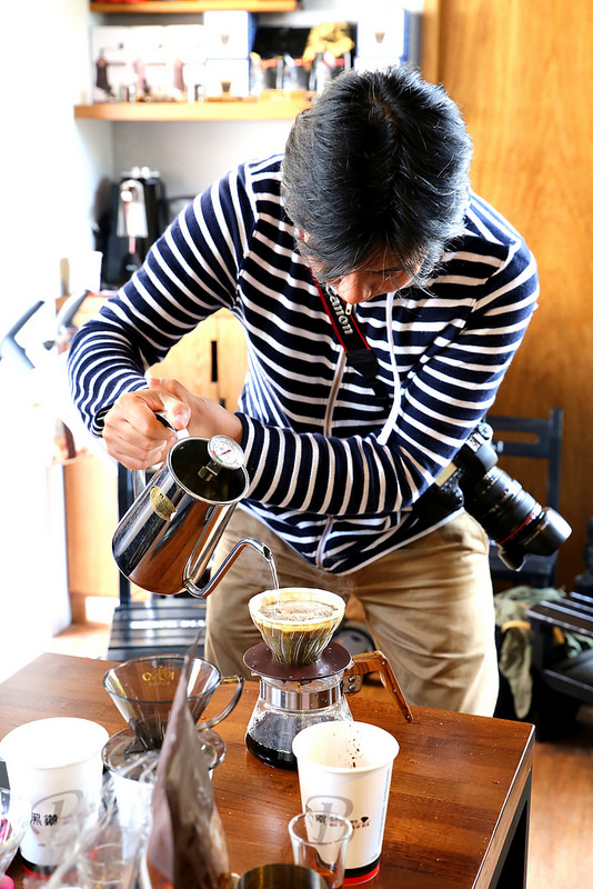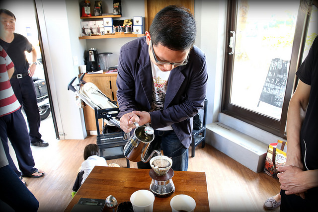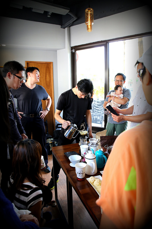 說要壓軸,撐到最後才肯上場的小虎哥,我就偏偏把他的照片排在第一個~哈哈,背著 CANON 6D 在沖咖啡,真是霸氣外露架勢十足啊!而平常就有在家沖煮咖啡的盆子哥就更不用說了,穩定的水柱、均勻的繞圈速度,肯定是今天表現最好的同學~