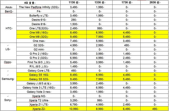 除了資費方案以外,還有搭配 4G 機型購機表格可以參考。