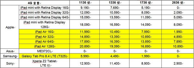 從這些資費方案中可以看到不論是首購或是換機、不論是學生或是大省,都有相對應的 4G 使用費率,而要注意的是,雖然合約有著 24 – 30 個月不等,但依照不同方案名稱,絕大部份是有著 9月 30日前慶祝開台的不降速無限瀏覽,而在[3G 升級4G 優惠方案]、[輕鬆fun 案 升級4G]、[iPhone 方案 升級4G]、[全能平板方案 升級4G]中,也有著4G 吃到飽的選擇。