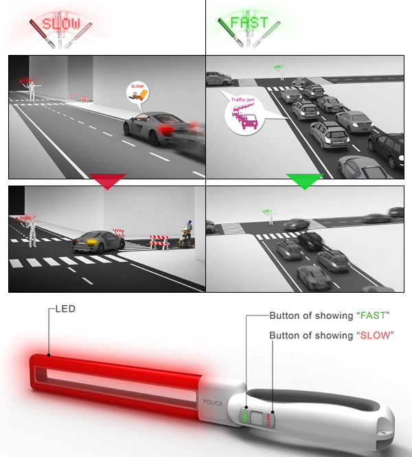 這種新型的指揮棒用以防止交通擁塞,同樣內建LED的燈管使其發光,在指揮棒上有功能控制鍵,控制快或慢的信號顯示,再經由左右搖動,產生不同顏色的”SLOW”或”FAST”信號顯示,這有字母的信號比單純的顏色信號更可引起駕駛人的注意目光,並有明確的速度行進提示,縮短駕駛人判別車況的時間並立即做出反應,在一定距離的遠端即可看到交通警察提示的信號。