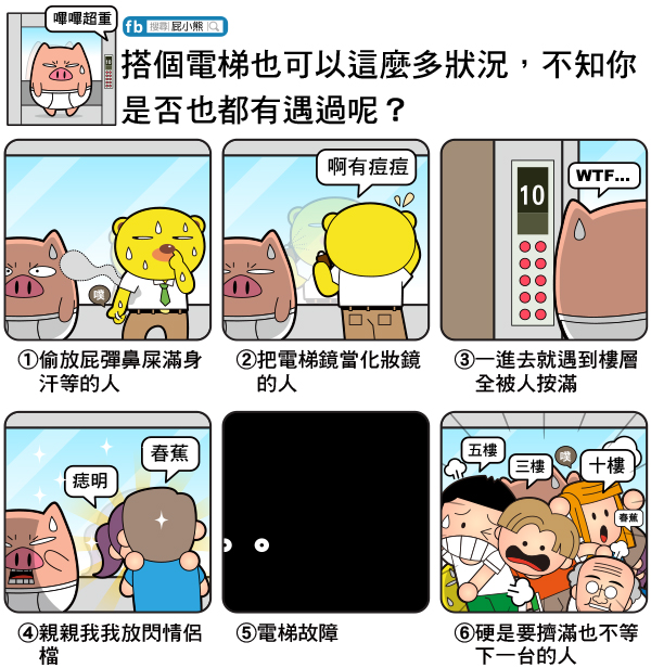 屁小熊 2014/05/12瀏覽: views 電梯這個小方格裡,其實也常上演許多新鮮事呢?不知你有遇過幾種呢? 以上是屁熊曾經經歷過的,每一樣單獨遇到也許都還好,有時還會鑲個合體計~~把電梯擠滿滿的然後每個人都滿身汗…這時真的是有股度秒如年的感覺啊~ 我在無人的電梯裡曾經偷偷放屁~結果打開出來時有人進去~ 那個人就是我耶!你這樣對嗎? 不過我最怕在高樓停電了…懸在高空的感覺真不是可怕可以形容的了…不過遇到這些都還好啦,如果是在日本…你可能會遇到以下這樣的情況… Related Items屁熊內褲豬電梯 好有趣 2014/05/12瀏覽: views 屁小熊 愛分享上班搞笑的屁熊還有內褲豬,職場不開心的話就快來找我們 ■作者:屁小熊 ■主題:職場、漫畫、生活、搞笑 ■個人網站:https://padbear68ee07.blogspot.com/ ■FB粉絲團:https://www.facebook.com/ppbear123 ■連絡方式:197968ee07@gmail.com Related Items屁熊內褲豬電梯 next page