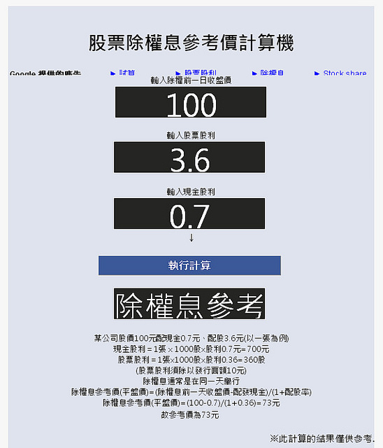 時序將要進入除權息的旺季,網路上有朋友詢問除權息的價格計算方式以及除權息前後賣出的獲利計算方式,小樂幫大家找到一個網站,下面的懶人計算機應該可以解決這個困擾!
