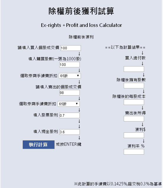 步驟:輸入買入及賣出的價格→選擇手續費→輸入除權除息 就能計算出 買入總付款→除權後擁有股數→除權後的每股成本→ 賣出後所得→獲利$