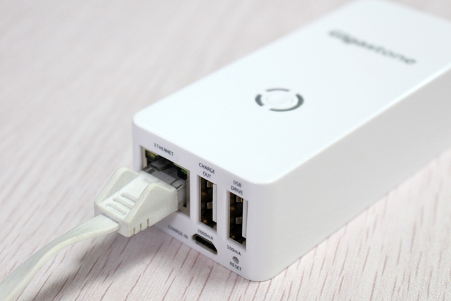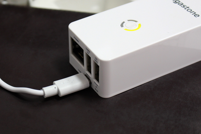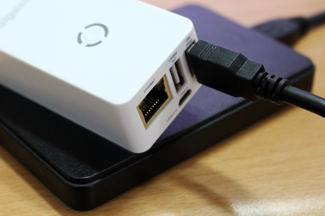 底部可以看到主要的傳輸介面,有乙太網路(Ethernet)接口、microUSB 充電孔、USB 充電接孔、USB 硬碟接孔以及重設 reset 按鈕,大部分都設計在這邊。