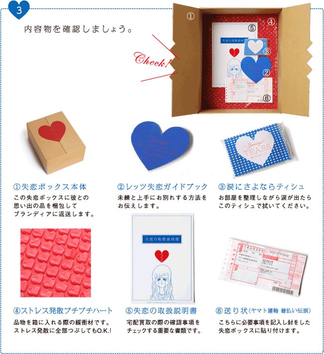 在與前男友或前女友分手後,最尷尬的是曾經他們贈送的、留下的東西例如生日禮物、卡片。留著觸景傷情,丟了又不忍心。為了幫助這些男男女女免於分手後的痛苦, 專門從事收購與轉售名牌商品的日本公司Brandear推出創新的服務-心碎箱,這個名字聽起來很負面,但它別具意義,失戀者可以把關於上一段戀情留下的物品裝入心碎箱,給Brandear公司回收,Brandear公司便會捐出約1美元來援助在開發中國家,協助懷孕婦女的非政府組織。所以,心碎箱的目的是把悲傷化為積極的力量。