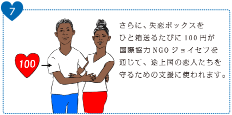 每公司回收一個心碎箱,Brandear公司便會捐出100日元,約1美元來援助在開發中國家,協助懷孕婦女的非政府組織。
