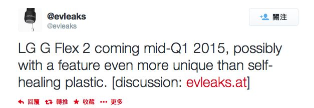 LG 正準備27日在新加坡等六地的新機發表會之時, @evleaks 爆料大神卻爆出 LG 將於 2015 年第一季推出新一代 G Flex 消息!