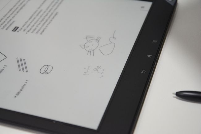 有三個實體按鈕(回覆、首頁、功能鍵)可以操作,13.3 吋的螢幕解析度為 1,200 x 1,600,雖然沒有彩色,但也具備了 16 級灰階,平常可以用隨附的筆在上方進行書寫筆記,真的是滿夠用的。