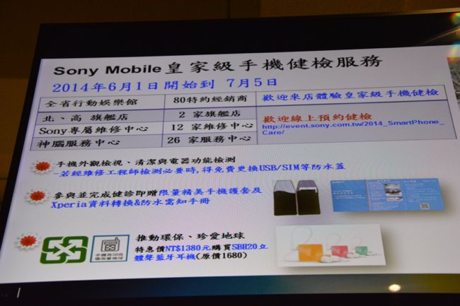 Sony 表示在今年推出的皇家級檢測服務中,包含了手機健診以及防水檢測服務。因此今年將服務據點擴充到 12 個Sony 指定維修中心與全省神腦國際 26 個指定據點。消費者除了可以透過預約來進行檢測服務以外,還能獲得限量的精美手機護套。而手機經過工程師檢測後,還能夠依照工程師判斷結果免費更換防水耗材,讓消費者的防水手機為你的 2014 夏天留下更多美好回憶!