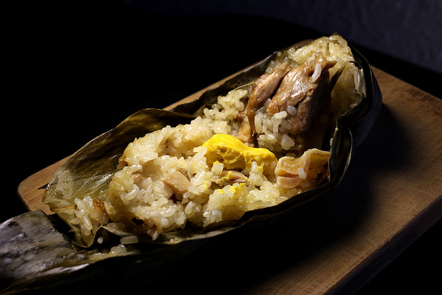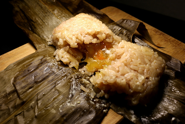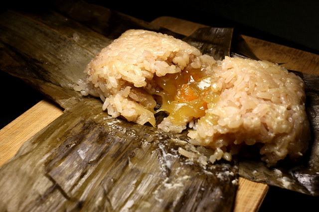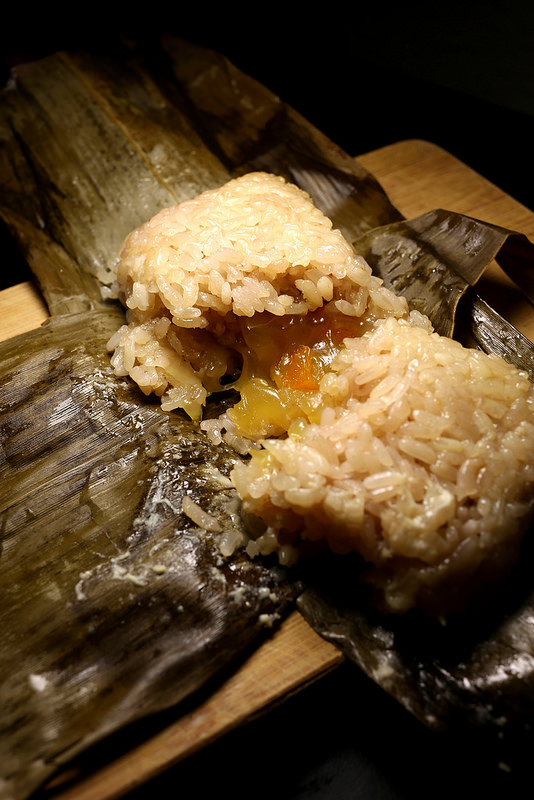 接下來的這個口味是大叔最喜歡的~「紹興竹香三寶粽」,打開粽葉的時候,撲鼻而來的酒香氣令人深呼吸了一下,真香啊!超犯規的大塊雞腿肉更是嫩到不像話,我猜想這就是主廚加入切成條狀的豬肚的原因,增加咀嚼的口感。裡頭的蛋黃跟高粱酒那顆比較起來,濕潤許多,不會有乾乾的卡在嘴裡的感覺。