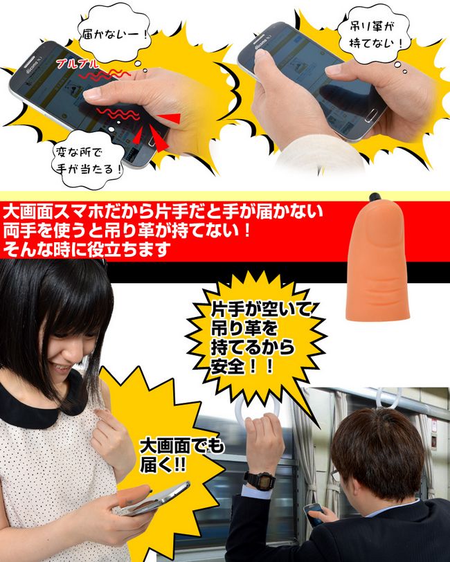 智慧型手機螢幕幕尺寸越來越大是一個不可否認的趨勢,雖然越大越好,但姆指較短的人會使用得很辛苦,因為單手使用較大尺寸行動裝置變得幾乎不可能。鬼點子的日本人總有辦法,生產許多古怪的小玩意日本零售商 Thanko推出這看起來愚蠢的拇指觸控筆解決短姆指人的困擾,延長觸控拇指,讓姆指瞬間多15mm!