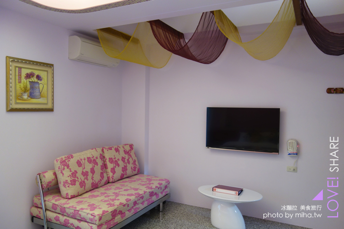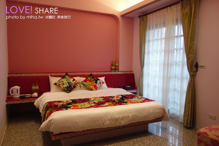 然後隔壁就是「花語雙人套房」,充滿浪漫的南洋風格跟粉紅色裝潢,但我是個女強人無法接受粉紅色房間,對這間房間興趣缺缺,我想少女應該都會很愛,男生請定這間給老婆女友。
